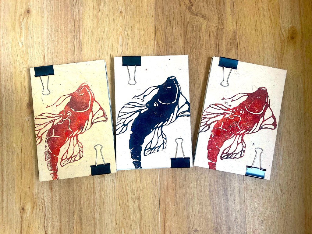 Matériaux : Carton, papier lokta lamali, papier peint de déstockage ou récup, Motif imprimé en linogravure.